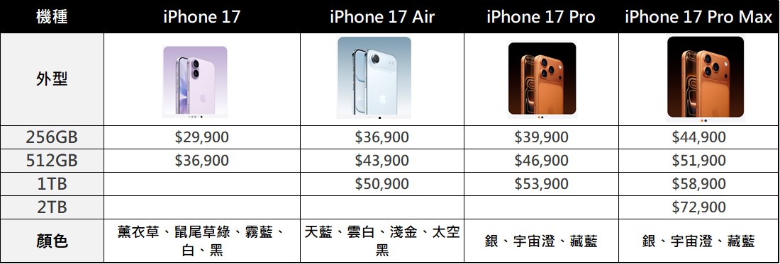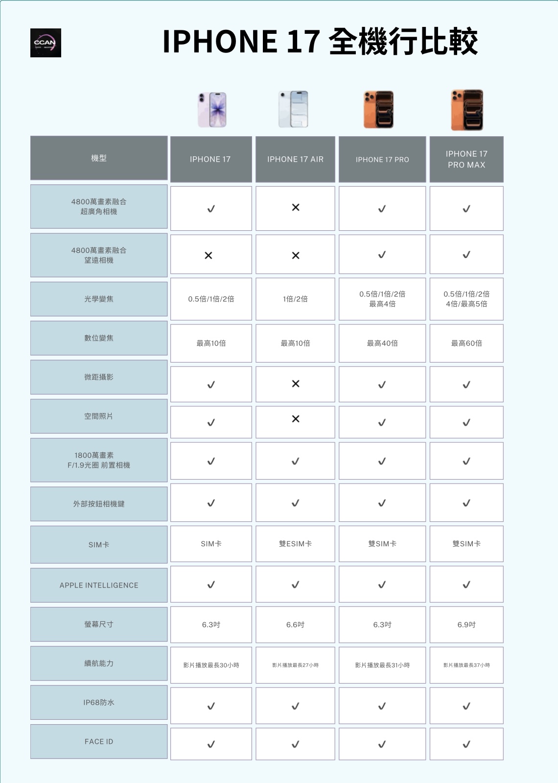 - 若以日常使用為主,IPhone 17 標準版或Air 已能滿足需求。