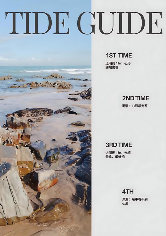• 退潮後 1 小時:海面反光溫和,拍照色調最浪漫